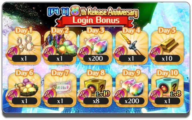 Details: For up to 10 days, players can receive rewards based on their total login days. The rewards include Gems, 8th Anniversary Coins, Pair Drive Fest Tix 2, and more.