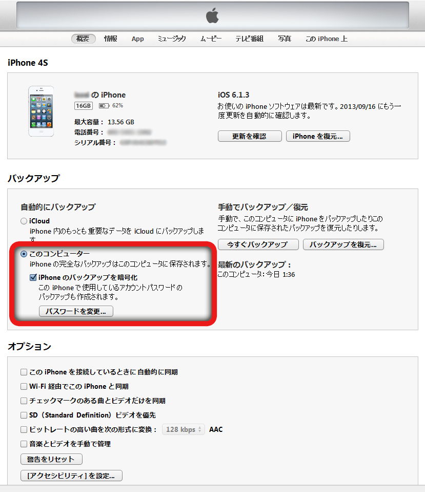 ※バックアップを作成する際は必ず「○○(デバイス名)のバックアップを暗号化」にチェックを入れてください。