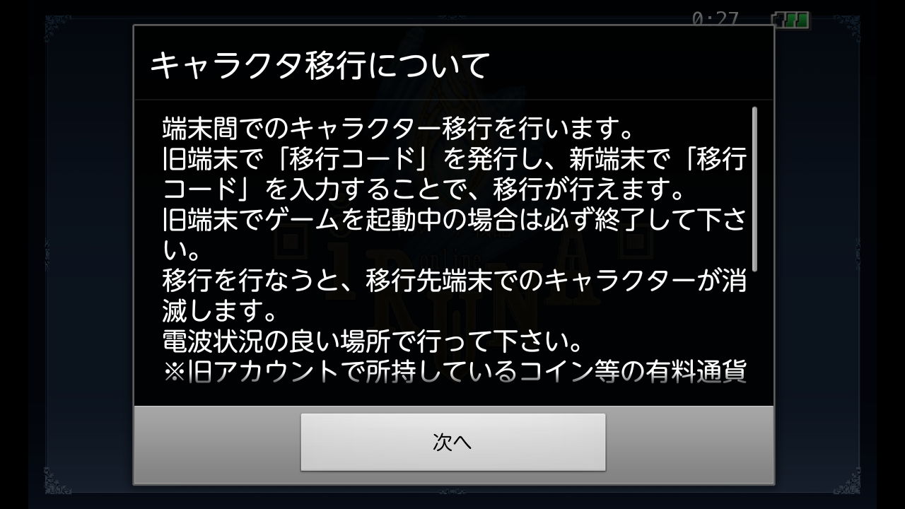 ※移行コードを用いたキャラクター移行を連続して行いますと、キャラクター情報が消滅する恐れがあります。